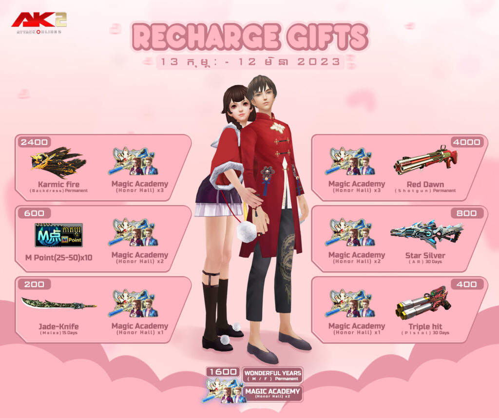 1. 200 AK Gold ទទួលបាន Space treasure chest free coupon*1 + Magic Academy(Honor hall)*1 +Jade-Knife(Melee) 15Days + New Year Present(Fragment)*2
