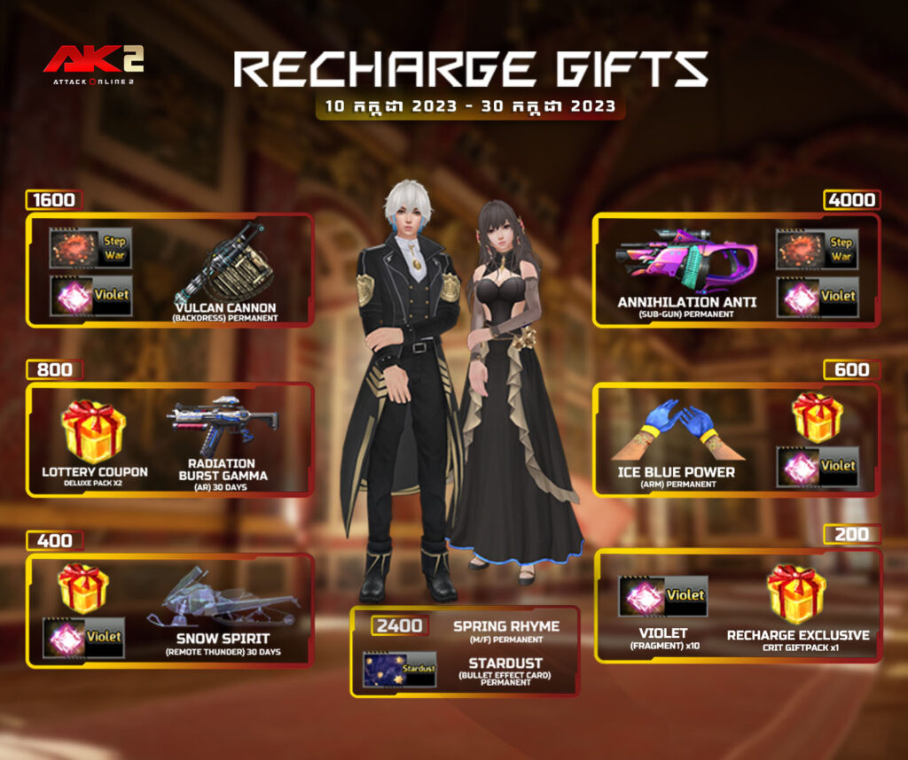 2. 400 AK Gold ទទួលបាន Recharge Exclusive Crit Giftpack*2 + Ice Blue Emotion(Fragment)*300 + Snow Spirit (Remote Thunder)30Days + Violet(Fragment)*2