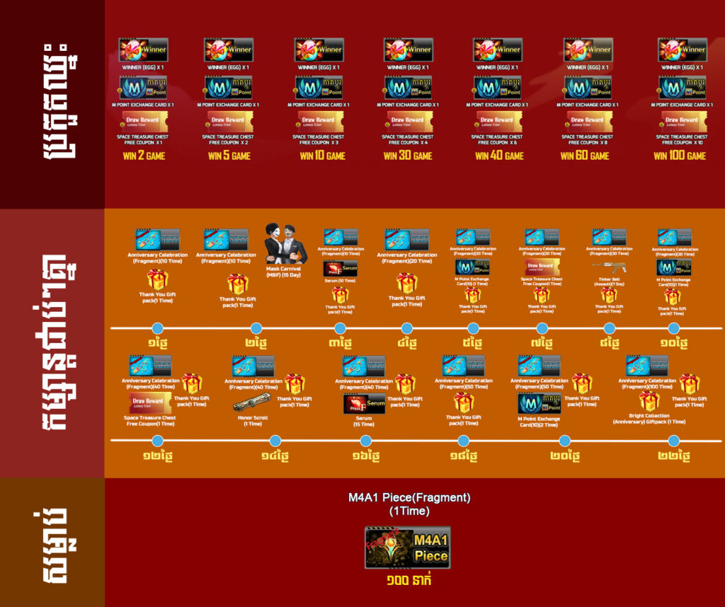 Old Soldier Comeback Day 25(Delayed Pack) : It takes 5 days to open the package | Regulus-Summer(Rapid-Fire Machine Gun) 15 days| Regulus-Sword(Melee) 15 days| Honor Scroll *1| Space treasure chest Free coupon *2|50M Point| Old Soldier Comeback Day 30(Delayed Pack)