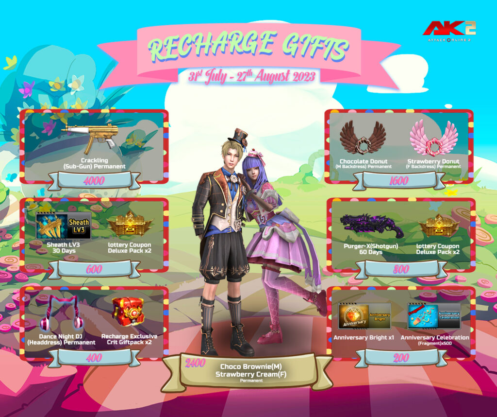 Recharge Exclusive Crit Giftpack:Open Giftpack must get 1 Honor Scroll and 1 Blue Rose(Flower)| Opening the giftpack has a very high chance (80%!) to generate a critical strike | after critical strike Blue Rose(Flower) will be replaced with one of the following items: Frost Beacon owl(Melee)15 days M18A1 (Claymore mine)15 days WildFire Dragon(Flamethrower)15 days Space treasure chest Free coupon *1~3 Space treasure chest Free coupon *10 Honor Scroll*1 100M Point