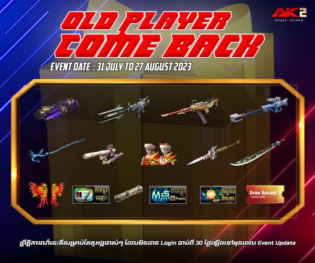 Old Soldier Comeback 30 Days luxury Gift (Giftpack) : Open to get | Purger-Immortality(Shotgun) 30 days| Rename Card 7 days| Reborn Card 50| Medical Bandage 50| Blue Rose(Flower) 50| Honor Scroll *1| Space treasure chest Free coupon *2| Old Soldier Comeback Day 2(Delayed Pack)