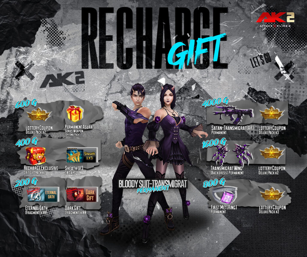 1. 200 AK Gold ទទួលបាន Recharge Exclusive Crit Giftpack*1 + Eternal Oath(Fragment)*100 +Dark Gift(Fragment) *100