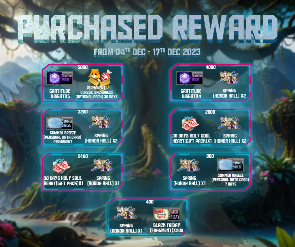 ចាប់ពី ថ្ងៃទី 04 ខែធ្នូ ឆ្នាំ 2023 ដល់ ថ្ងៃទី 17 ខែធ្នូ ឆ្នាំ 2023 បន្ទាប់ពីការ Update នូវ Version 2.1.6.757 ទៅ 2.1.6.758 រួចរាល់ហើយអ្នកកម្សាន្ដទាំងអស់អាចចំណាយ AK Gold ដើម្បីទទួលបានសម្ភារៈពិសេសៗដូចខាងក្រោម៖