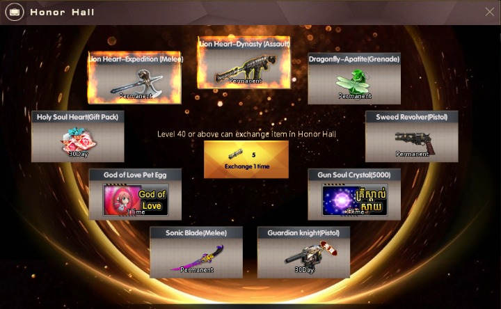 Martial Trial(Gift pack):Open must get 1 Heart of War(Fragment), 2 Gunslinger Holy Soul(Fragment), and get one of the following items randomly:
