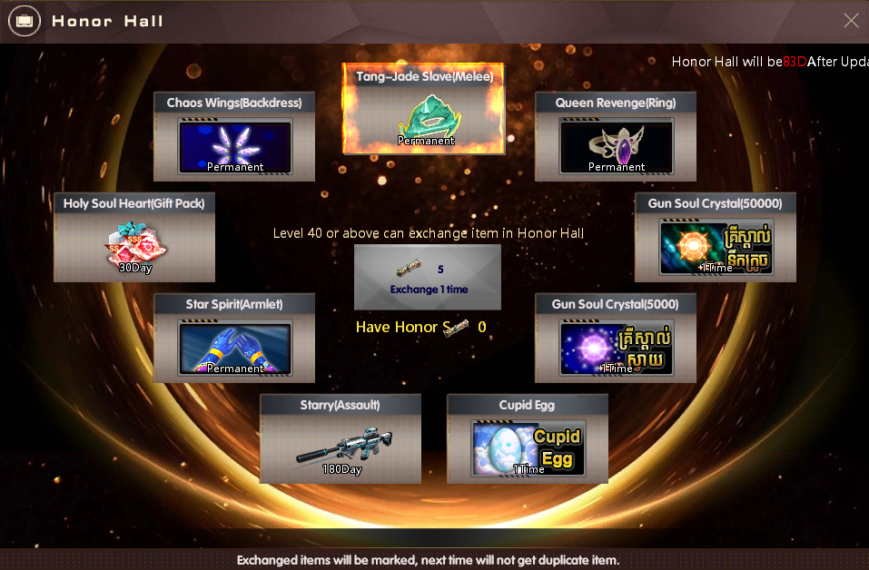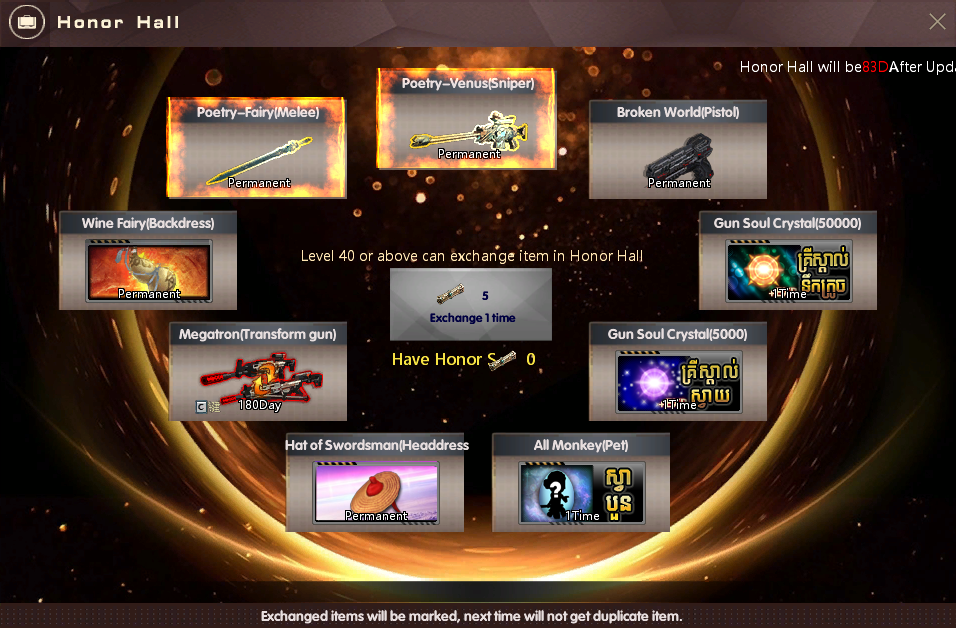 ចំណាំ : បន្ទាប់ពីលោកអ្នកធ្វើការបញ្ចូលគ្រប់ 4000 AK Gold ហើយ , រាល់ការបញ្ចូលបន្ថែម 800 AK Gold ពីលើនេះ លោកអ្នកនឹងអាចទទួលបាន ៖