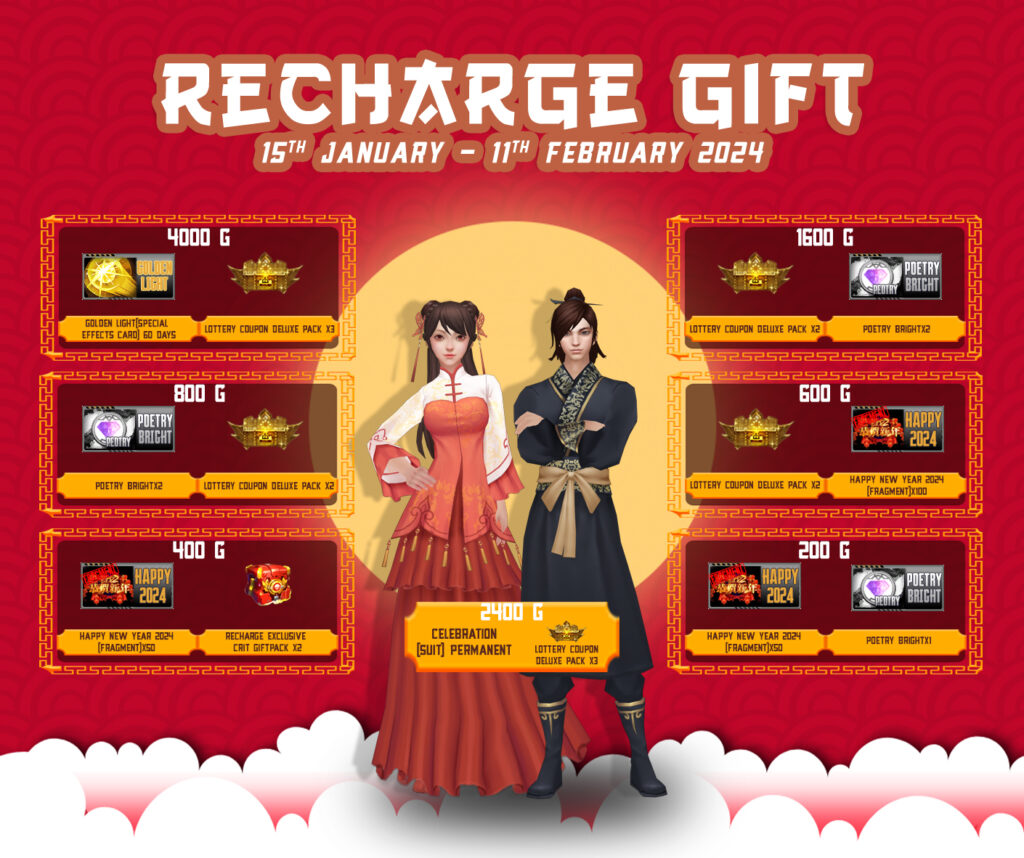 ចាប់ពី ថ្ងៃទី 15 ខែមករា ឆ្នាំ 2024 ដល់ ថ្ងៃទី ១១ ខែកុម្ភៈ ឆ្នាំ 2024 អ្នកកម្សាន្ដទាំងអស់គ្រាន់តែចូលកម្សាន្ដនឹងទទួលបានរង្វាន់ដូចខាងក្រោម៖