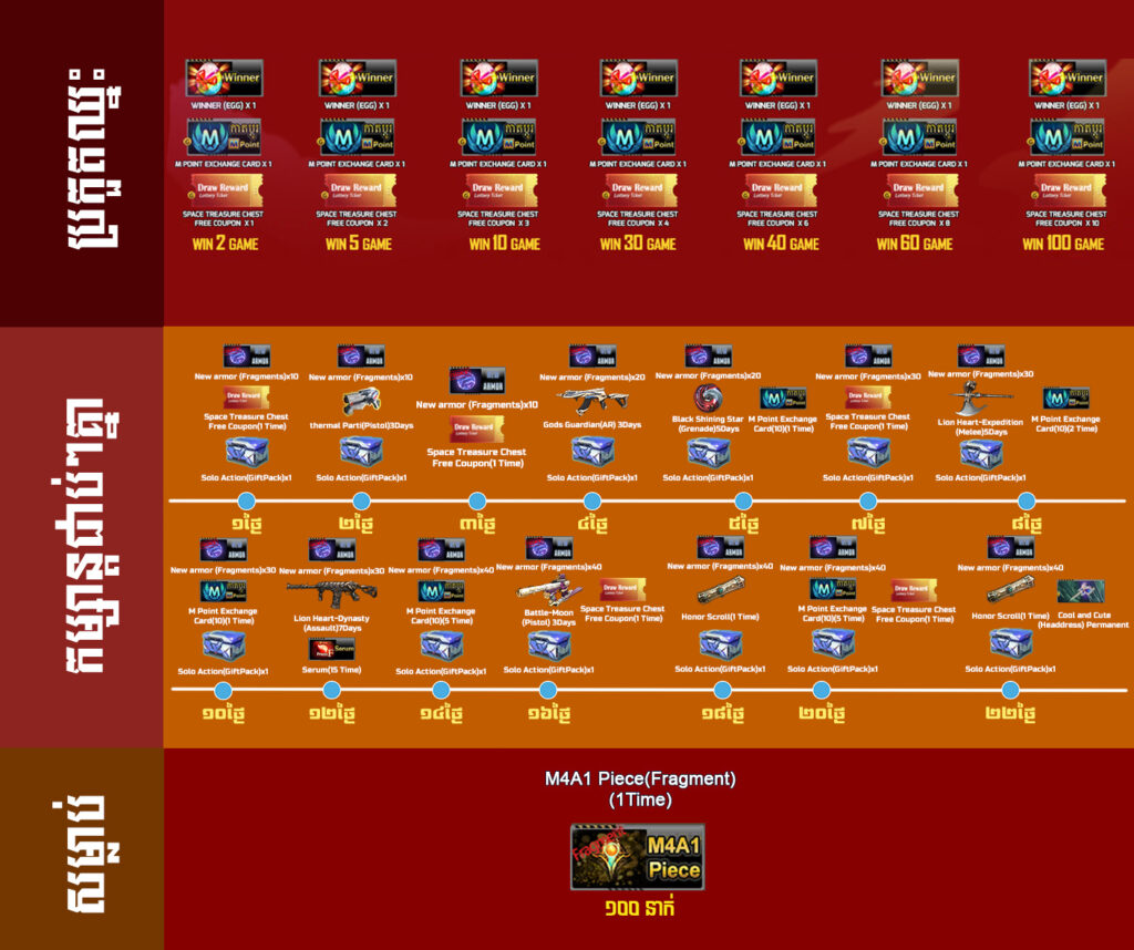 ចាប់ពី ថ្ងៃទី 11 ខែមីនា ឆ្នាំ 2024 ដល់ ថ្ងៃទី 07 ខែមេសា ឆ្នាំ 2024 អ្នកកម្សាន្ដទាំងអស់គ្រាន់តែចូលកម្សាន្ដនឹងទទួលបានរង្វាន់ដូចខាងក្រោម៖