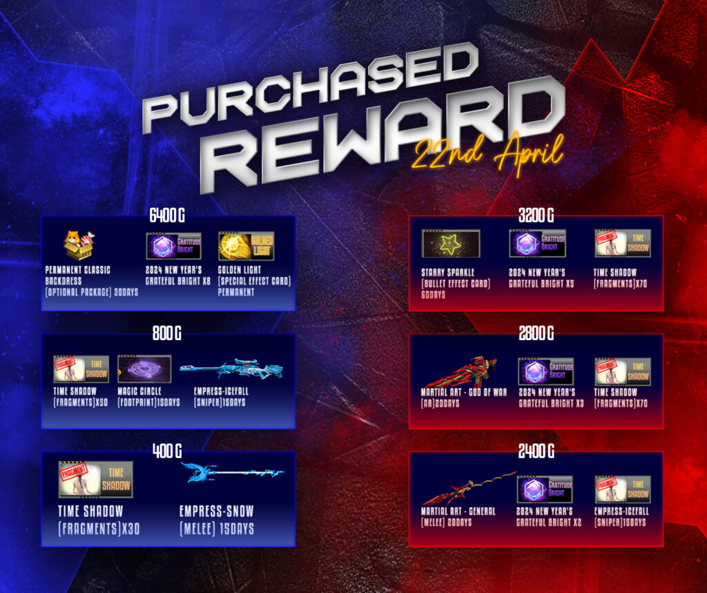 ចាប់ពី ថ្ងៃទី 22 ខែមេសា ឆ្នាំ 2024 ដល់ ថ្ងៃទី 05 ខែឧសភា ឆ្នាំ 2024 បន្ទាប់ពីការ Update នូវ Version 2.1.6.769 ទៅ 2.1.6.770 រួចរាល់ហើយអ្នកកម្សាន្ដទាំងអស់អាចចំណាយ AK Gold ដើម្បីទទួលបានសម្ភារៈពិសេសៗដូចខាងក្រោម៖